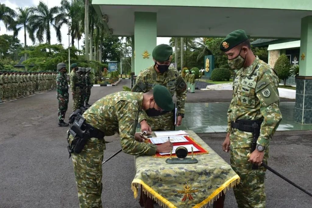 PENBPR18 – Danbrigif Para Raider 18/Trisula Kolonel Inf I Gusti Bagus Putu Wijangsa memimpin Acara tradisi korp raport penerimaan warga baru, penyerahan jabatan Dandenma Brigif Para Raider 18/Trisula dan Wadanyonif Para Raider 503/Mayangkara di Mabrigif Para Raider 18/Trisula, Jabung, Malang. Kamis (20/01)