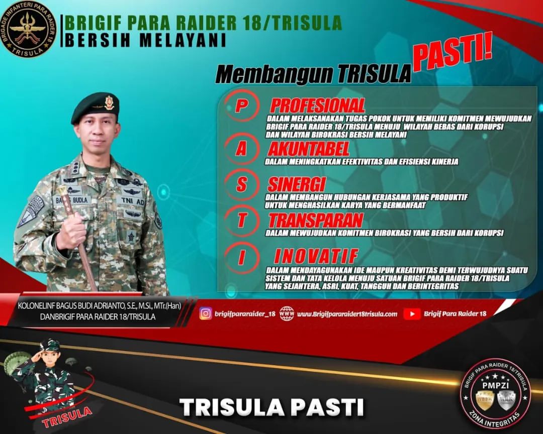 Danbrigif Para Raider 18/Trisula dalam penyampainya menyampaikan, bahwa keberhasilan pembangunan Zona Integritas sangat ditentukan oleh kapasitas dan kualitas integritas masing-masing individu, yang mempunyai relevansi dalam peningkatan kapasitas dan kualitas integritas dari organisasi, dimana individu tersebut berada dan melakukan kegiatannya.